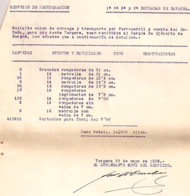 Los albaranes de material militar llegados hasta Bergara, durante toda la campaña del Norte que reforzarán su esfuerzo de guerra hasta caer Bilbao, lo demuestran. Toneladas de material no sólo de guerra sino de intendencia y abastecimientos para sostener a una gran masa de hombres en constante movimiento y esfuerzo de guerra y con un eje, poco conocido, al que denominarían como «Objetivo Bilbao».