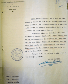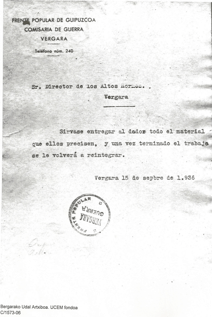 El 15 de septiembre de 1936ko La Comisaría de Guerra del Frente Popular de Bergara entregaba la siguiente nota a la dirección de Altos Hornos de Bergara, “Sirvase entregar al dador todo el material que ellos precisen, y una vez terminado el trabajo se le volvera a reintegrar”(4) .