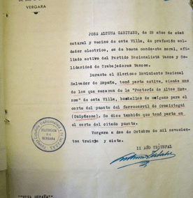 Jose Altuna Garitano nacido en Bergara, militante del PNV y de STV. Gudari voluntario en el Batallón San Andrés, primero como teniente, tras ser herido en combate fue ascendido a Capitán. Una vez detenido, -declaro que no habia participado en el corte del puente-, fue condenado a 30 años y un dia de prisión (15).