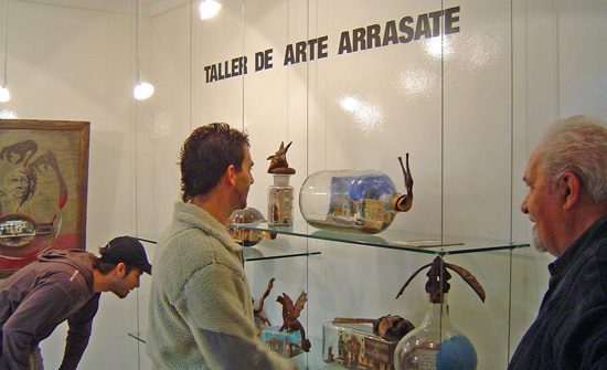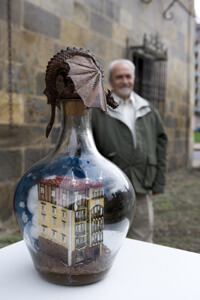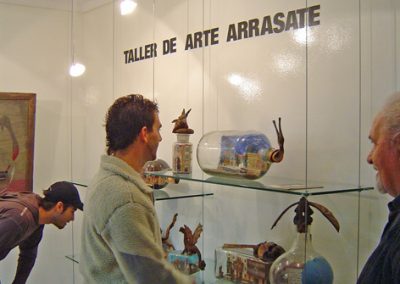 Las obras que voy a exponer tienen muy marcada la parte afectiva, tiene más afectos que mensajes, hay alguna que incluso no dice nada y mucho menos de la actualidad. Como sabía que se celebraban acontecimientos de octubre de 1934 he hecho algunos comentarios. Hago referencia a la calle donde yo nací: Arrabal de Magdalena, al Trinkete o Casa del Pueblo, y a la fecha de 1934. Me refiero en otra botella a las declaraciones de Marcelino Oreja . Hago referencia al Portalón y pongo los nombres de mondragoneses que tantas veces le oí a Tatxo Amilibia. Después en la botella del ayuntamiento pongo la ikurriña y Presoak Euskal Herrira, esta petición va unida a Justizia barik pakerik ez dago, que lo escribo en la parte de atrás. Yo conocí la ikurriña en Buenos Aires, y me dio una rabia terrible no haberla conocido en Arrasate.