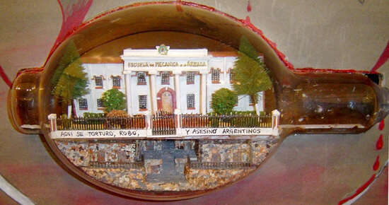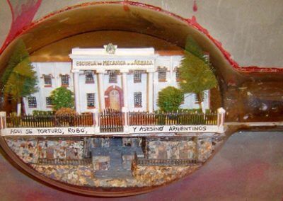 La Escuela Mecánica de la Armada es una de las obras que más me gusta y la que tiene una significación más importante. Esa escuela queda muy cerca de mi casa y además está muy cerca de la cancha del River. Cuando el mundial de fútbol de 1976 -que ganó Argentina- los periodistas de todo el mundo hacían referencia al mundial diciendo que se escuchaban tiros, que había muertes cerca de la cancha del River, se referían a la Escuela Mecánica de la Armada, que está a 300 metros no más de la cancha. Ahí en los sótanos se torturaba, además todo era ilegal, de repente les metían en camiones y a ellos les decían que les estaban dando una vacuna y que eso significaba que iban a ir a una cárcel oficial y que se iba a oficializar el que ellos fueran presos, ¡mentira!, se les estaba dando un calmante para dejarles dormidos, meterlos en un avión y tirarlos al mar. Es de una magnitud terrible esa obra que he hecho. Yo tengo el taller y la exposición a la vista del público y entre la gente que pasa, muchos se quedan impresionados, unos me felicitan, otros lo rechazan y algunos no me saludan más, porque piensan completamente distinto a lo que pienso yo.